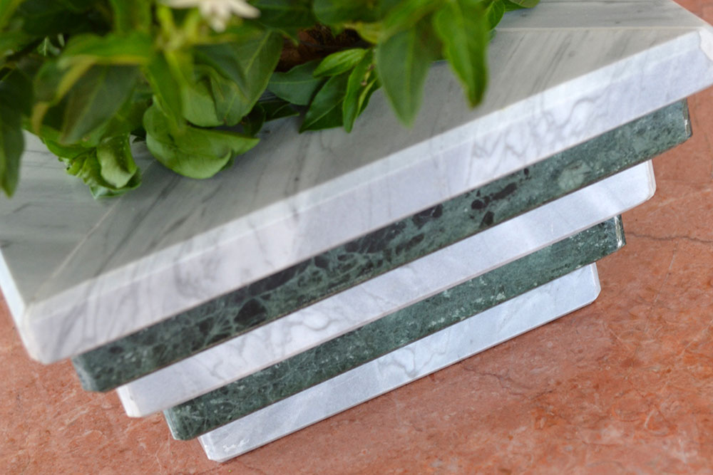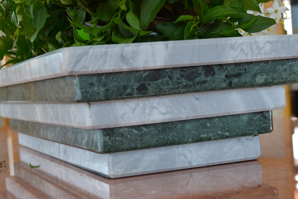 Il centro tavola è stato realizzato con due tipologie di marmi, marmo "verde guatemala" alternato con il marmo bianco "carrara". Il marmo VERDE GUATEMALA è un marmo di colore di fondo verde intenso, molto duro e compatto è adatto sia per interno che per esterno. Il marmo Bianco Carrara è la migliore qualità del marmo italiano ed ha un fondo bianco con leggere macchioline grigie. Il centro tavola è stato rifinito con una lucidatura che esalta i colori di questi due marmi nobili. Disponibile in blocchi e lastre.