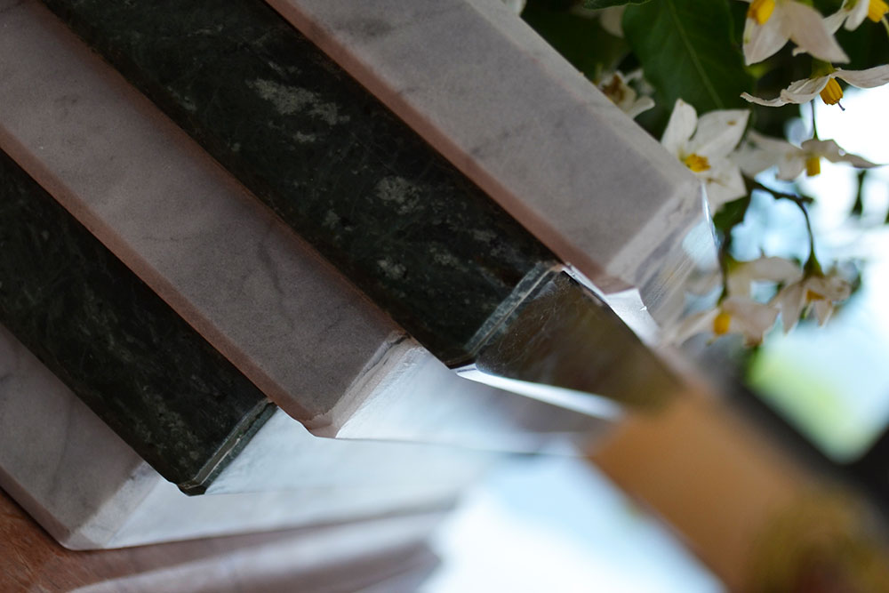 Il centro tavola è stato realizzato con due tipologie di marmi, marmo "verde guatemala" alternato con il marmo bianco "carrara". Il marmo VERDE GUATEMALA è un marmo di colore di fondo verde intenso, molto duro e compatto è adatto sia per interno che per esterno. Il marmo Bianco Carrara è la migliore qualità del marmo italiano ed ha un fondo bianco con leggere macchioline grigie. Il centro tavola è stato rifinito con una lucidatura che esalta i colori di questi due marmi nobili. Disponibile in blocchi e lastre.